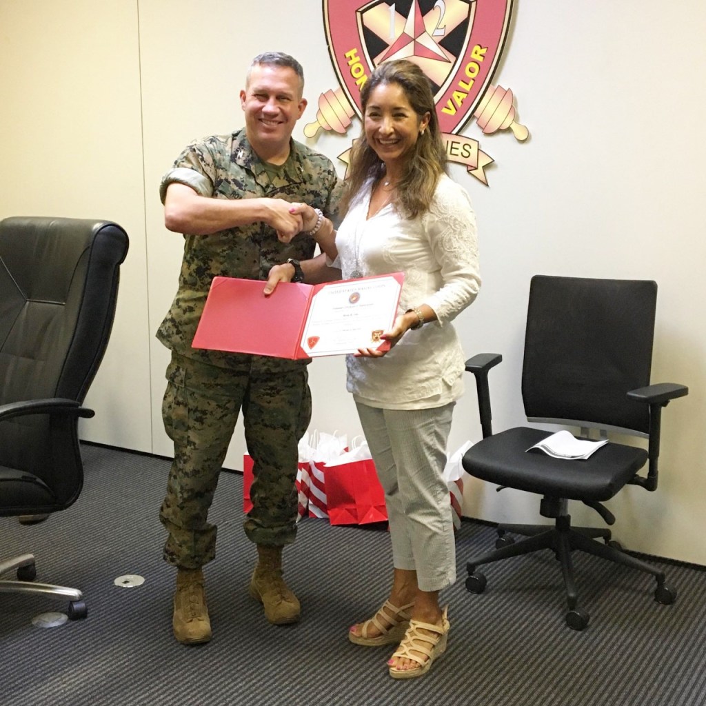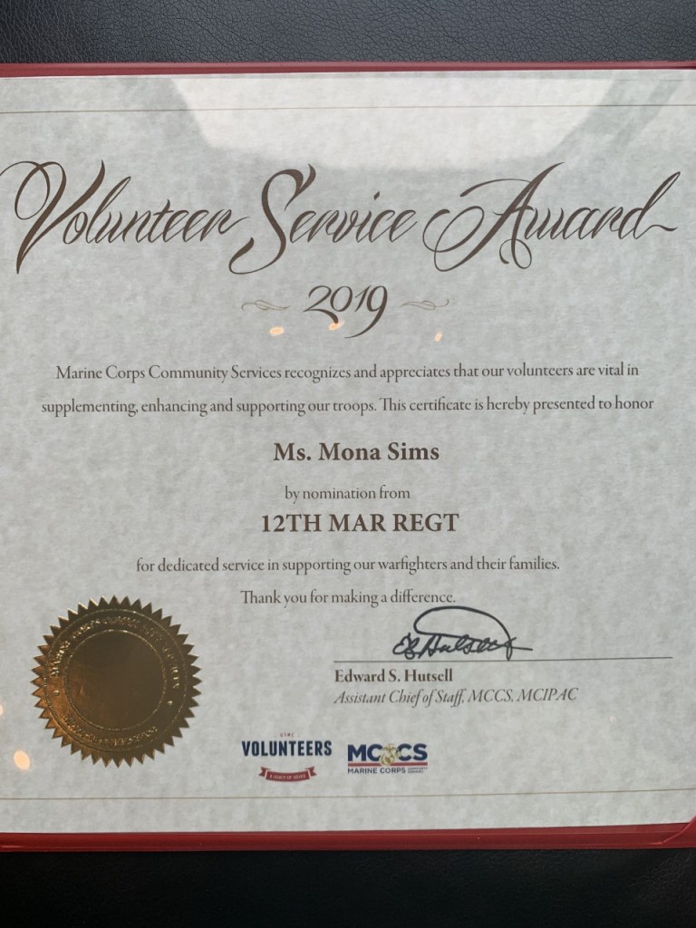 Recently, I was presented two awards from my husband’s military unit for service to the Marines and their families. One award is specifically given to those people who don’t submit volunteer hours so that they can be recognized, and we are nominated by someone else because they want to ensure that we are recognized for our efforts. I should preface this by stating that I currently collect and submit volunteer hours for another organization because I think that people should be recognized for their volunteer efforts. I refuse to submit mine, so I obviously have a conflicting relationship with volunteerism and personal recognition. I want to recognize others; yet, I prefer to stay out of the views of recognition. The picture of me receiving one of the two awards shows me smiling more nervously than proudly.