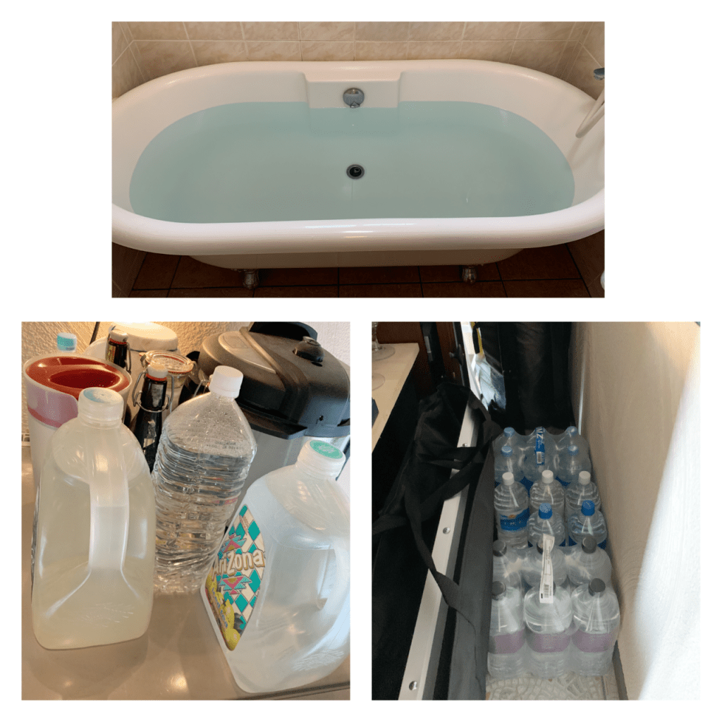 Some of the things that I wanted to make sure we had in place included WATER. We drink a lot of water, and we use it to prepare our meal-replacement shakes. We need water for our dog, and if we lose water again, we will need it to rinse off our bodies. I purchased water. I filled up containers of water for our dog, Gus, and I filled up our tub. I cleaned and cleaned the tub, but I am not sure if I would actually use it to drink. However, it can be used for bathing and to flush toilets. It could also be boiled if we get desperate. Boiling can be done on the grill that has a propane tank or our gas-stovetop.