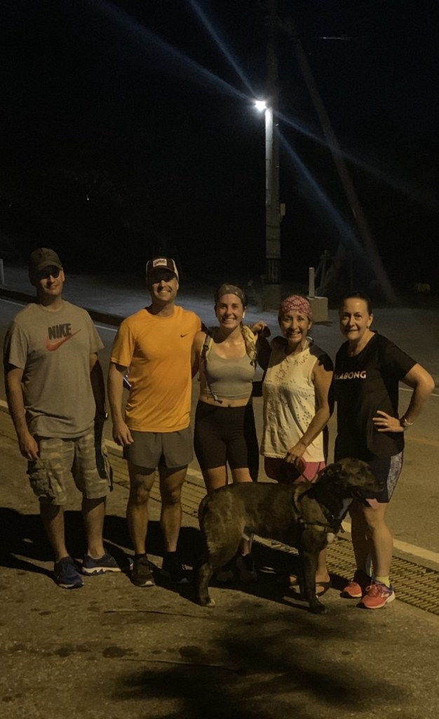 This past weekend. Kellie (center), the marathon runner, me next to her on the right, and surrounded by friends at aid station 1.