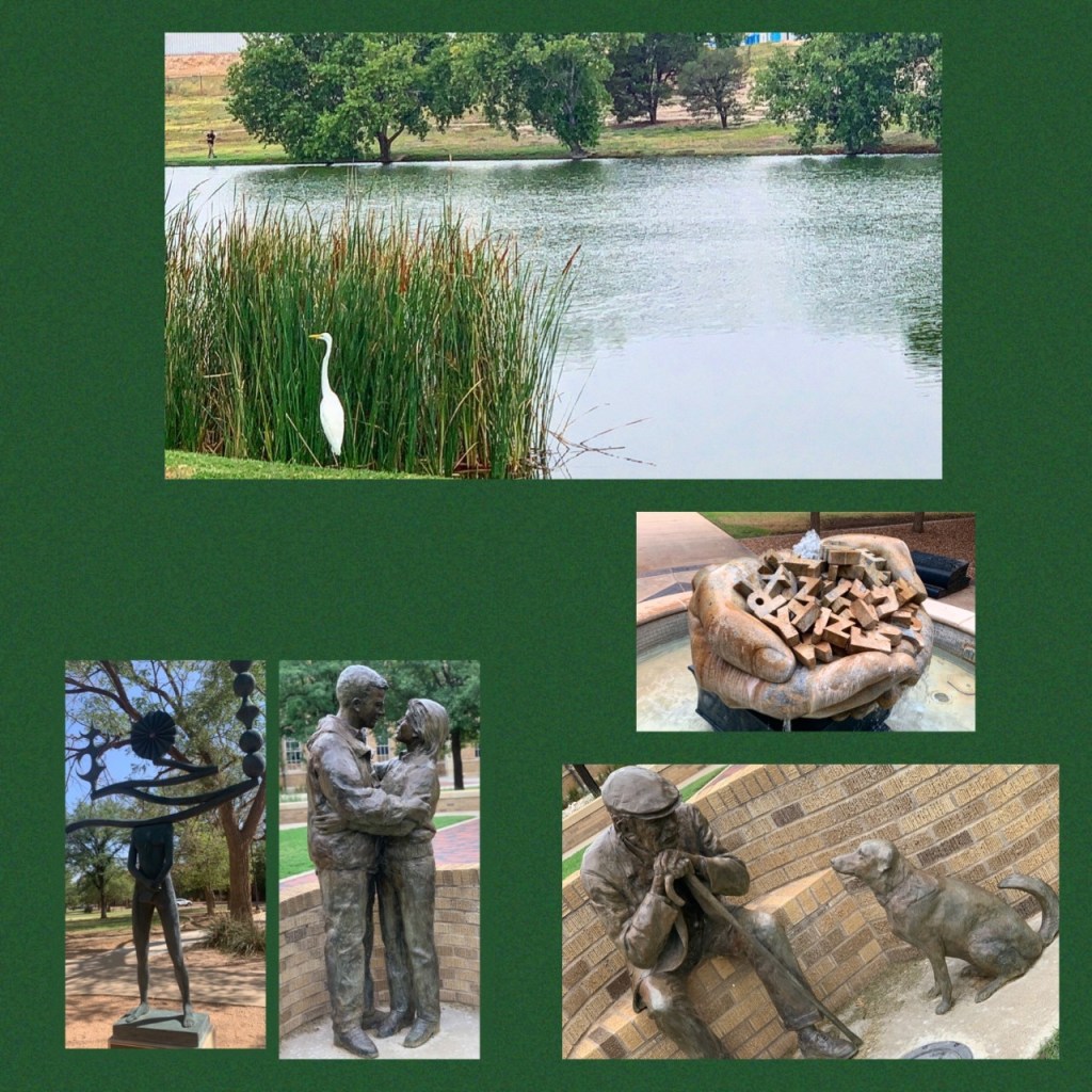 The top picture is Hodges Park. The other pictures are of art that I found on the Texas Tech campus. All of the pictures are taken on various runs.