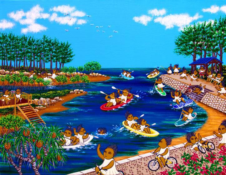 Nature Mirai is one of my favorite places on the island. When we were limited on where we could go during Covid, I spent a great deal of time running. It was one of the few things that I could actually do so I ran every day, and I explored a great deal of the island on foot. One the places that I went most often was down into the Nature Mirai valley, and once there, I could escape the confines of Covid. The valley was my safe haven. Because I wanted a special memory of this place, I asked Kyoko to create a piece of art with the girls in the valley. A couple of months later, the girls were running, swimming, biking, and kayaking in a place where I had spent so much time in real life. They had joined me in the valley. I was so grateful that Kyoko took the time to create this special piece of work for us, and it will always be cherished.